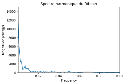 Dans le graphique ci-dessous, on a représenté une partie du spectre harmonique du bitcoin. En effet, bien que cette analyse puisse paraître relativement compliquée, l’approche mathématique permet de confirmer (ou non) nos hypothèses. Ainsi, l’axe des ordonnées (magnitude) représente l’intensité du cycle de la fréquence en abscisse. En termes clairs, cette étude nous permet d’identifier les durées des principaux cycles.