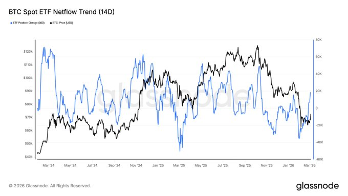 Les données on-chain indiquent également une évolution des conditions du marché. Une analyse de Glassnode montre que la tendance des flux nets des ETF sur 14 jours est récemment redevenue positive. Les semaines précédentes avaient enregistré des sorties constantes.