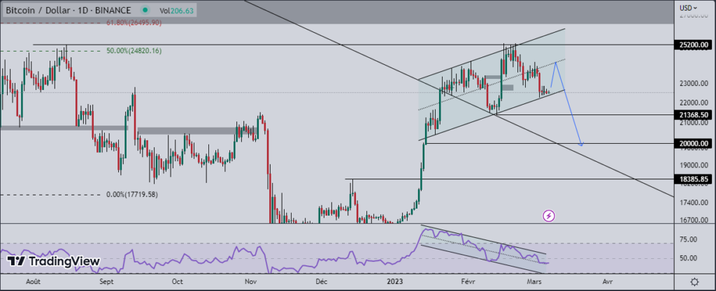 On pourrait envisager une hausse au-dessus de 23 673 $, si le BTC réalise le creux de la semaine aujourd’hui. En effet, on constate la présence d’un mini-support sur le niveau 22 086 $. Le prix du bitcoin (BTC) pourrait alors prendre les sell stops qu’il y a en dessous de ce niveau, avant de repartir à la hausse. Si le prix réalise un sommet plus haut que celui du week-end aujourd’hui, on pourra envisager le scénario 2. Compte tenu de la situation de Silvergate, appuyé par la présence d’une divergence RSI à l’échelle daily, le scénario 2 semble le plus probable. Ainsi, une position short serait la plus adéquate.