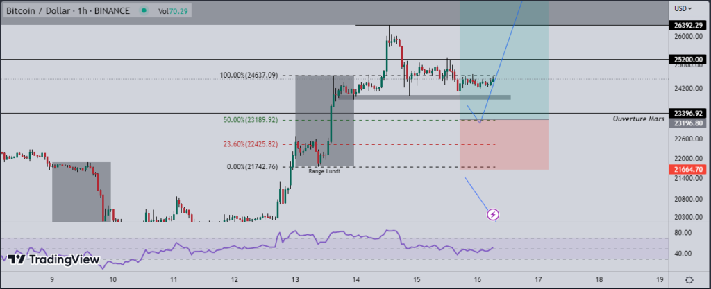 L’élan haussier depuis vendredi pourrait se poursuivre compte tenu de la situation économique aux États-Unis. Ainsi, on pourrait miser sur une hausse du BTC jusqu’à 30 000 $, la prochaine résistance psychologique. Dans ce cas, le fib level 50 % du range lundi semble être un point d’entrée intéressant pour acheter du BTC.