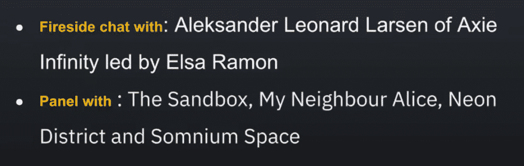 Puis une seconde partie (2), consistant en un panel de plusieurs intervenants de l’écosystème des NFTs vidéoludiques avec Anna Norvik d’Antler Interactive développant le jeu MyNeighborAlice, Artur Sychov de chez Somnium Space, Sebastien Borget de The SandBox et Marguerite DeCourcelle de Blockade Games développant le jeu Neon District.