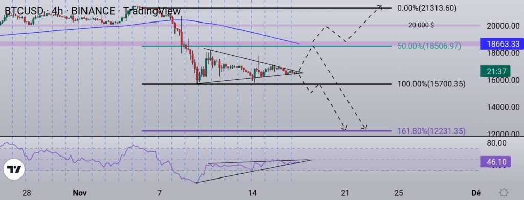 Le prix du bitcoin se rapproche progressivement de l’extrémité pointue du triangle. Par conséquent, il faut s’attendre à l’éclatement de cette figure d’ici peu. Après le mouvement de compression actuel, on pourrait envisager deux scénarios possibles pour le bitcoin. Le premier serait la cassure du triangle vers le haut. Mais ce sera une fausse cassure, car le prix va se heurter à une résistance critique. Il s’agit de la zone 18 519 $ et 18 620 $, qui s’aligne également avec le niveau 50 % de l’outil de Fibonacci. Mais pas que, la moyenne mobile 100 (4 h) se trouve sur le même niveau. Ce qui en fait une résistance pertinente. Après cela, on pourra envisager le bitcoin descendre jusqu’à 12 243 $.