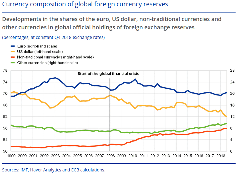 L’UE importe près des 2/3 de son énergie et n’a tout simplement plus les moyens de payer. L’ardoise est devenue si grosse que le monde a peur d’accumuler davantage d’euros et de dollars, et cela depuis 2013. Cette tendance est très claire sur ce graphique de la BCE :