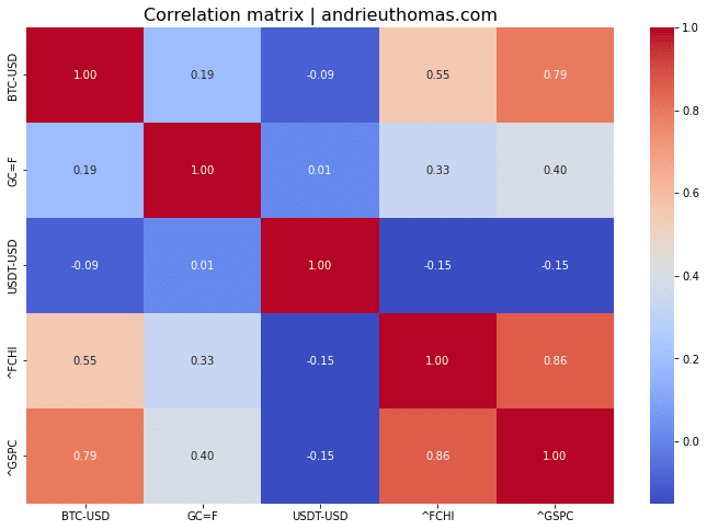 Du tableau précédent, on en déduit aussi le lien qu’il existe entre le bitcoin et l’or, mais encore entre le bitcoin et le dollar. Il est notable que la corrélation entre le bitcoin et le dollar, que nous pouvions théoriquement supposer négative, est presque inexistante. Cependant, le cours de l’Or, par le truchement du S&P 500, semble bien légèrement corrélé au cours du bitcoin (BTC). Cette corrélation est malgré tout assez faible (+20 %), mais suffisamment notable pour être remarquée, et trop faible pour en tirer des conclusions.