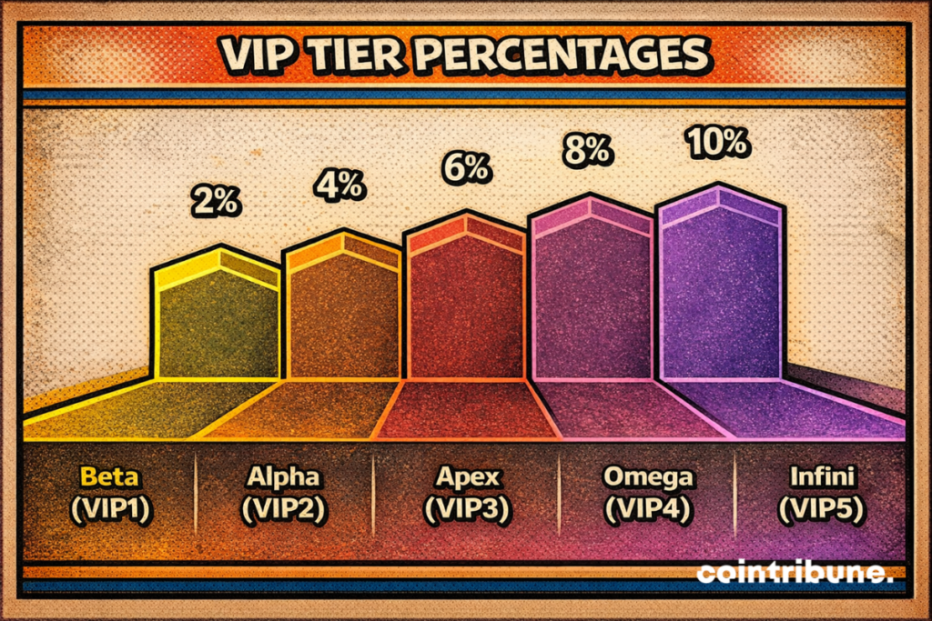 Bybit’s VIP program relies on a five-level structure designed to reward the most active users. These levels (Beta, Alpha, Apex, Omega, and Infinite) are assigned based on asset balance and monthly trading volume. Each tier unlocks progressive advantages, ranging from increased cashback to exclusive services.