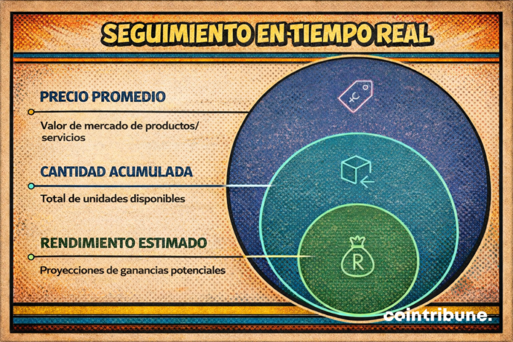 Tras iniciar el bot, puede acceder a un panel que agrupa los datos clave: precio medio de compra, cantidad adquirida, rendimiento estimado, número de compras realizadas. Esta información ofrece un seguimiento preciso de la estrategia en curso.
