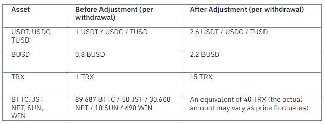 Dans sa première proposition, Binance a dévoilé les ajustements suivants concernant les prix de retraits sur Tron.