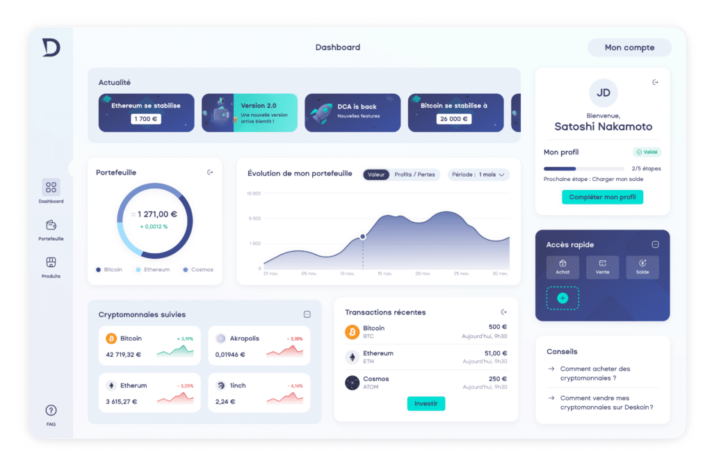 « D’un projet né en 2018, Deskoin a pour vocation de révolutionner votre épargne. Notre plateforme permet à quiconque d’investir simplement sur plus de 25 actifs numériques au meilleur prix et de profiter d’un support client sans coût supplémentaire.