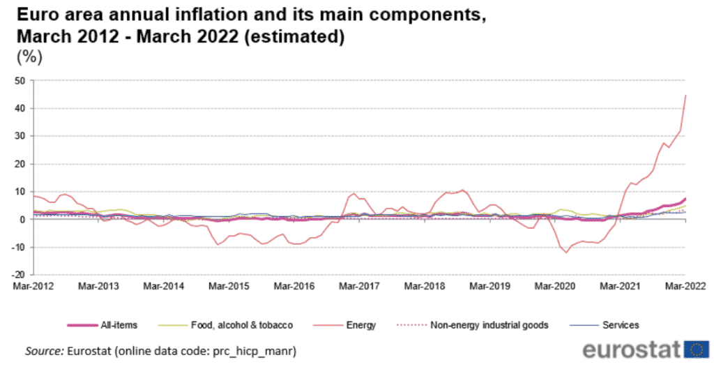 Sur une note plus fondamentale, notons que l’inflation continue de battre des records. Sur un an, les prix ont augmenté de 7,6 % dans la Zone Euro. Et ce n’est rien comparé à ce qui nous attend. En Allemagne, les grandes chaînes alimentaires viennent d’annoncer des hausses de prix allant de 20 % à 50 %.