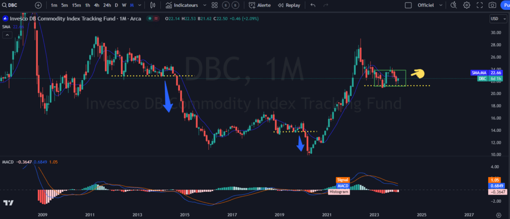 D’un point de vue technique, on peut voir que nous avons un seuil et un niveau support assez résilient sur le graphique. Tant qu’on reste à l’intérieur de la zone latérale encadrée. Pour faire pression sur une baisse de l’inflation en dessous de 3%, il faudrait une cassure vers le bas des matières premières qui pourrait se traduire par une accélération de ralentissement économique.