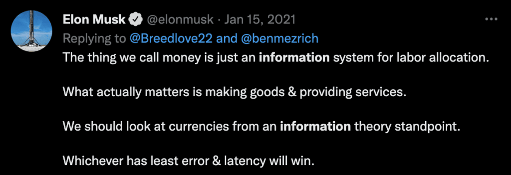 Elon considère qu’une bonne monnaie doit transporter efficacement l’information. Par « information », Musk fait sans doute référence à la quantité d’incertitude à laquelle elle met fin. La monnaie doit donc réduire le bruit pour allouer efficacement les ressources économiques qui sont rares (hors du jardin d’Eden).