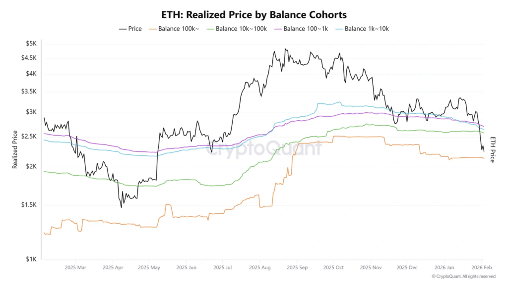 Les ventes ont augmenté dans plusieurs groupes de portefeuilles. Les adresses détenant entre 100 et 1 000 ETH, ainsi que celles possédant entre 1 000 et 10 000 ETH, ont réduit leur exposition. Les données de CryptoQuant montrent plus de 600 000 ETH distribués par ces cohortes au cours de la semaine passée. De tels flux indiquent de la prudence plutôt qu’une accumulation parmi les investisseurs particuliers et détenteurs de taille intermédiaire.
