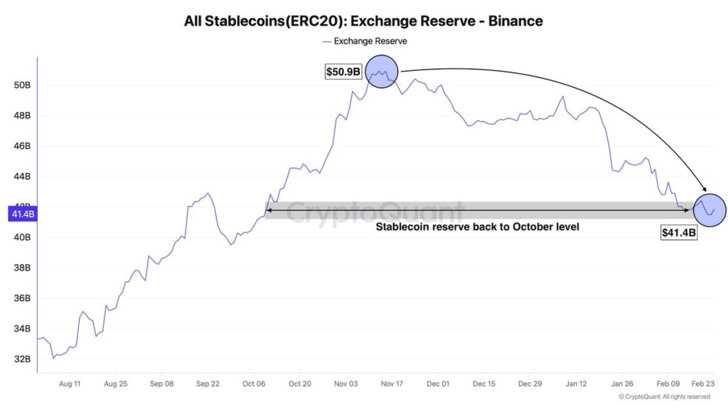 Les données de CryptoQuant montrent que les réserves de stablecoin sur Binance ont chuté à leurs niveaux les plus bas depuis plusieurs mois. Les stablecoins représentent souvent des capitaux en attente sur la touche. Des soldes en baisse peuvent signaler des capitaux quittant l’exchange plutôt que se préparant à une nouvelle exposition.