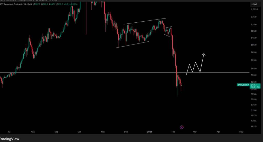 À l’heure actuelle, la structure technique se situe à un point critique. L’indice de force relative (RSI) est descendu près de 30, plaçant le BNB en territoire de survente. Historiquement, des lectures du RSI proches de 30 autour de supports majeurs ont coïncidé avec des rebonds locaux. Plus tôt ce mois-ci, de longues mèches inférieures se sont formées entre 600 $ et 615 $ avant que les acheteurs n’interviennent.