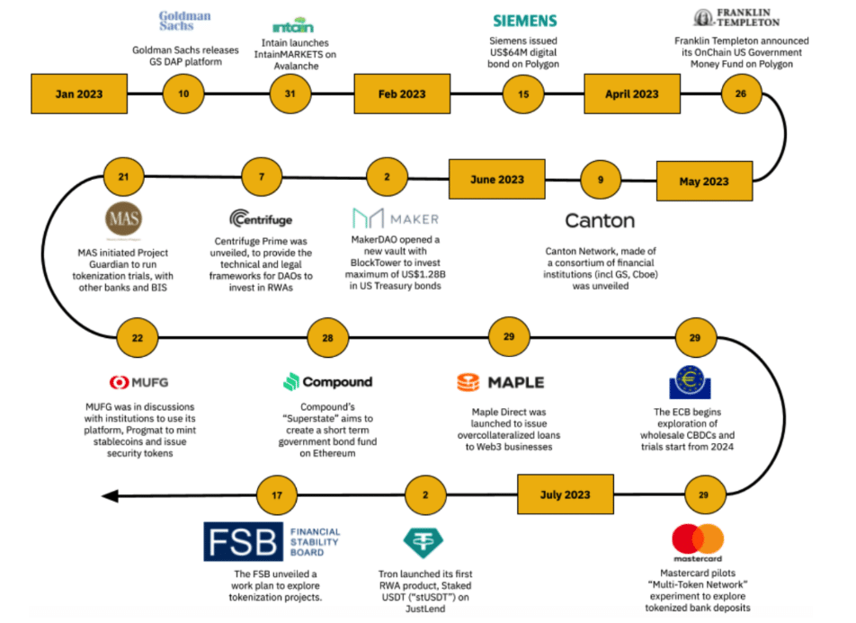 Les actifs du monde réel (RWA) sont des actifs tangibles et intangibles tels que l’immobilier, les obligations et les matières premières, qui sont traditionnellement situés en dehors de la blockchain. Au troisième trimestre, les actifs du monde réel sont devenus de plus en plus populaires et ont commencé à attirer l’attention de certains grands acteurs institutionnels : quelques projets ont été développés pour fournir une meilleure infrastructure pour l’adoption institutionnelle avec une crédibilité et une légitimité accrues. Voici un bref résumé de quelques développements marquants :