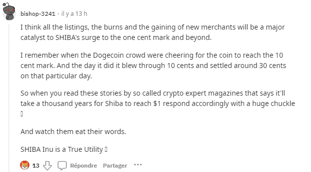 Le rêve d’un SHIB à 1 cent pourrait-il devenir réalité ? C’est ce que pense bishop-3241, auteur d’un long commentaire et d’une analogie avec le DOGE :